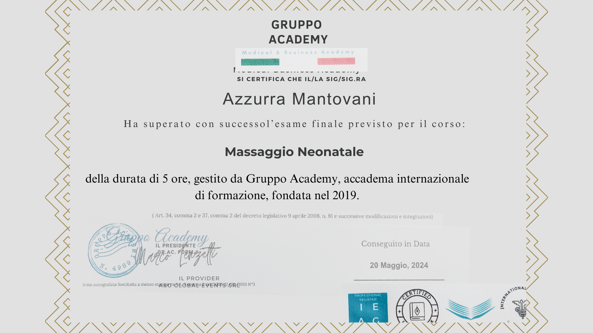 - 16/02/2005-13/012006 Corso di perfezionamento di 250 ore “accompagnamento alla nascita” presso la facoltà di Medicina e Chirurgia dell’Università di Brescia ( ID Progetto FSE 242952)