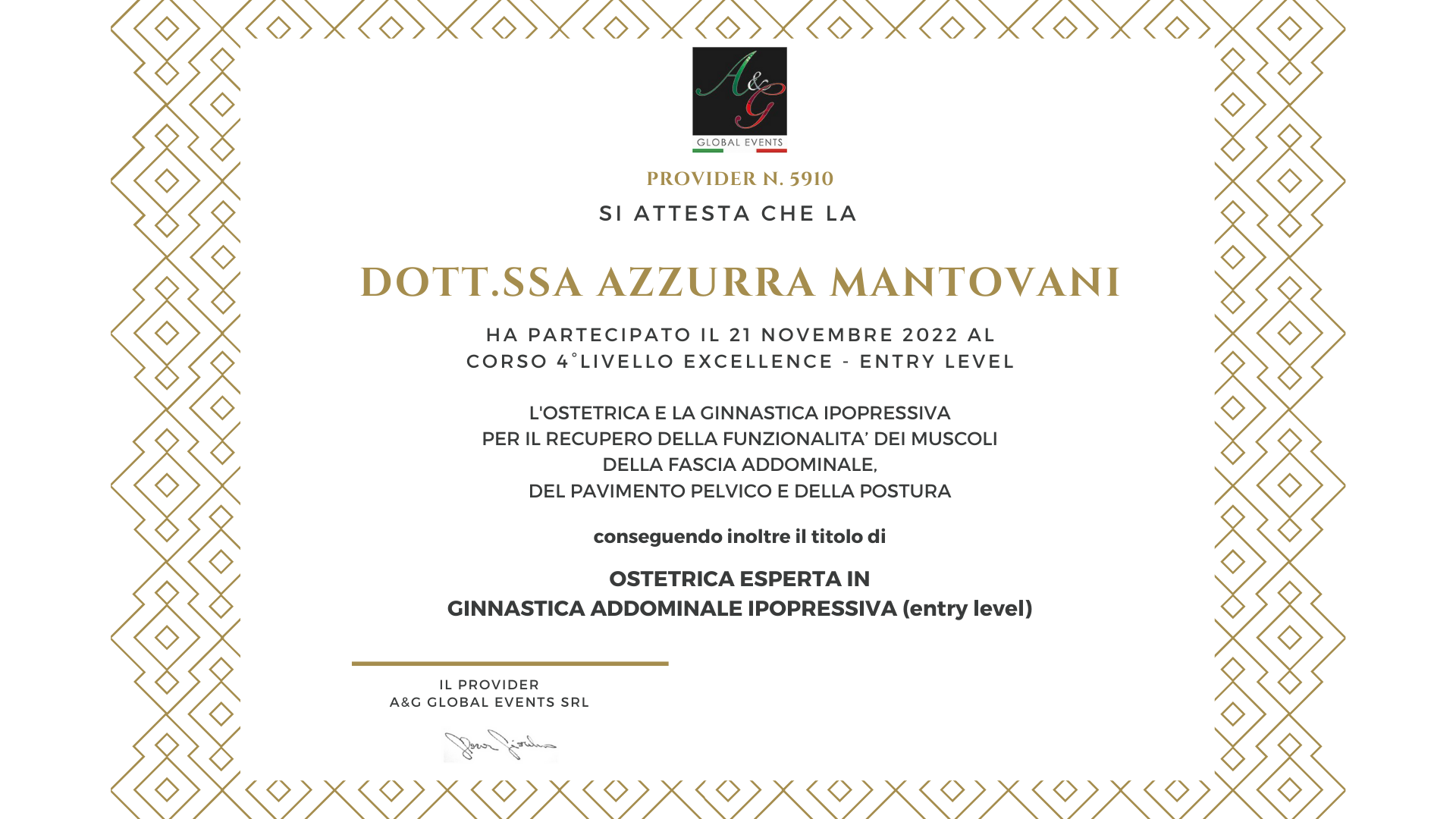- Anno Accademico 2005-2007 Master di Primo Livello di Coordinamento delle Professioni Sanitarie, Area infermieristica ed ostetrica, presso L’Università Carlo cattaneo (LIUC) di Castellanza (Va) con dissertazione elaborato finale il 25.09.2008; Formazione di un’equipe per il “Pavimento Pelvico”: il ruolo del coordinatore ostetrico